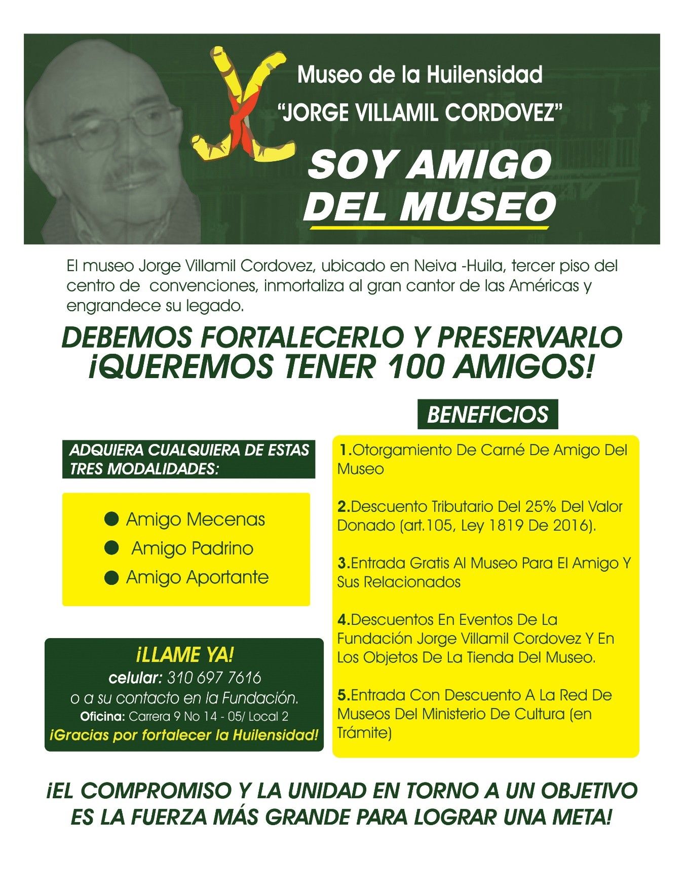 El museo jorge villamil cordovez, ubicado en neiva, huila, en el tercer piso del centro de convenciones ala cultural, se creó para hacer inmortal al gran cantor de las américas y engrandecer su legado difundiendo sus raíces, su folclor y su música.